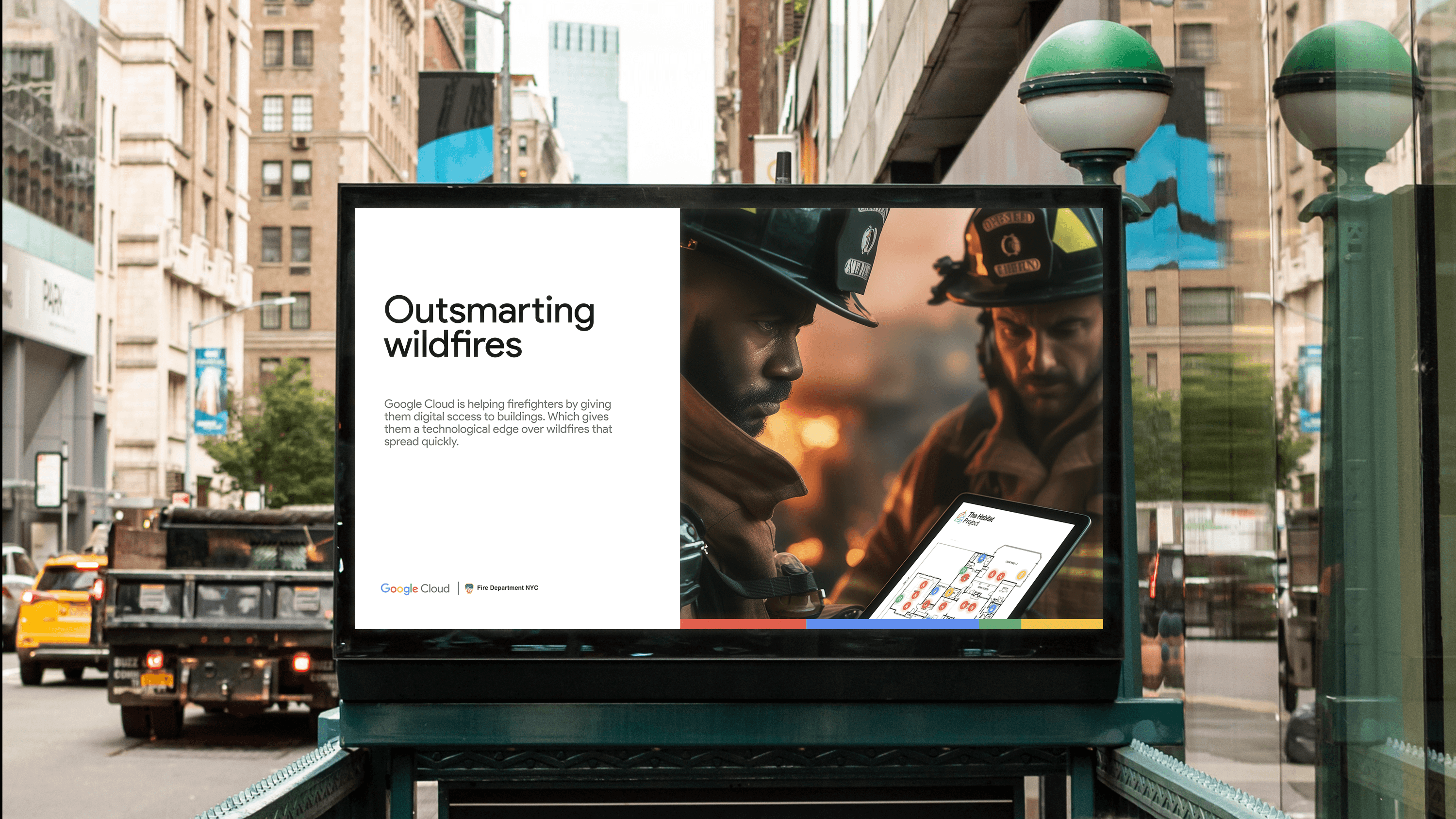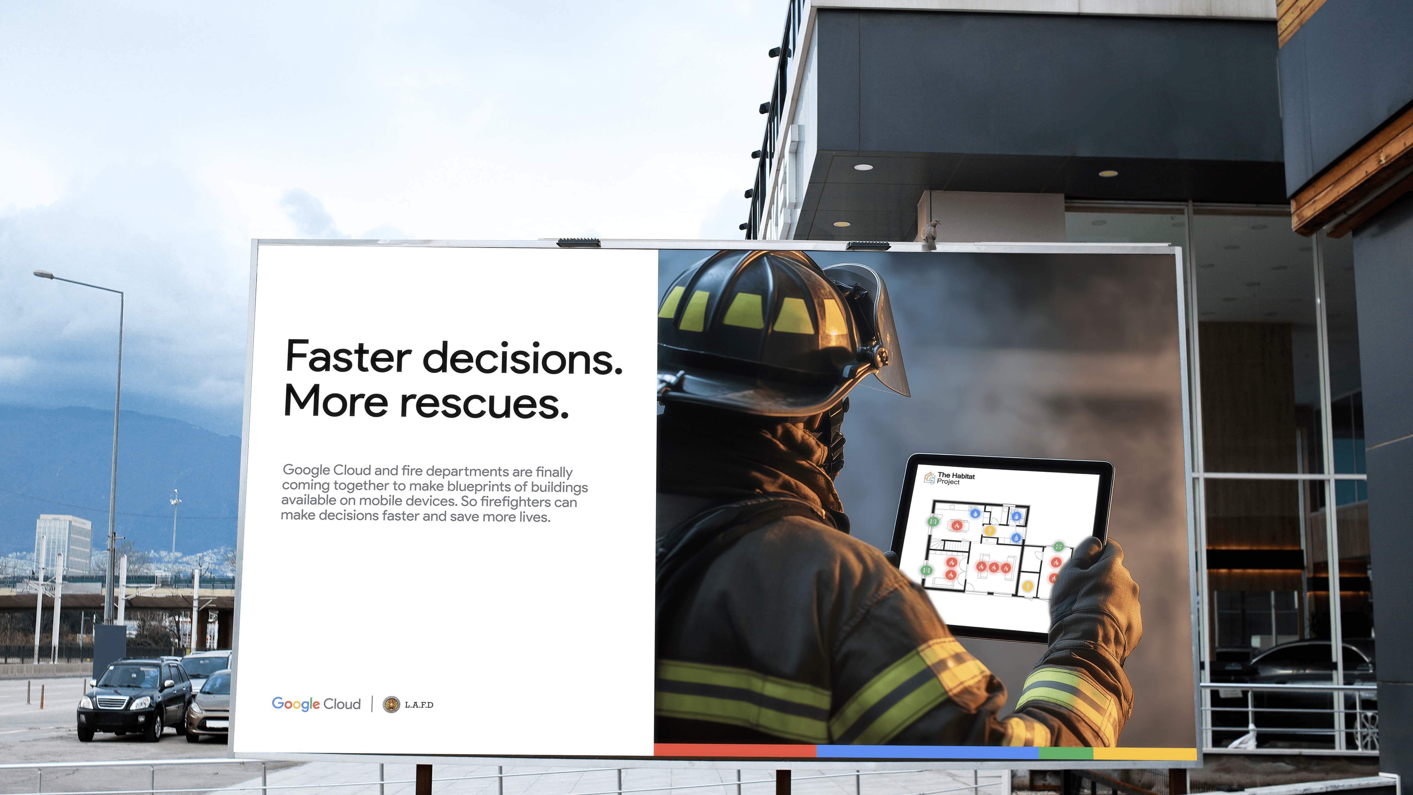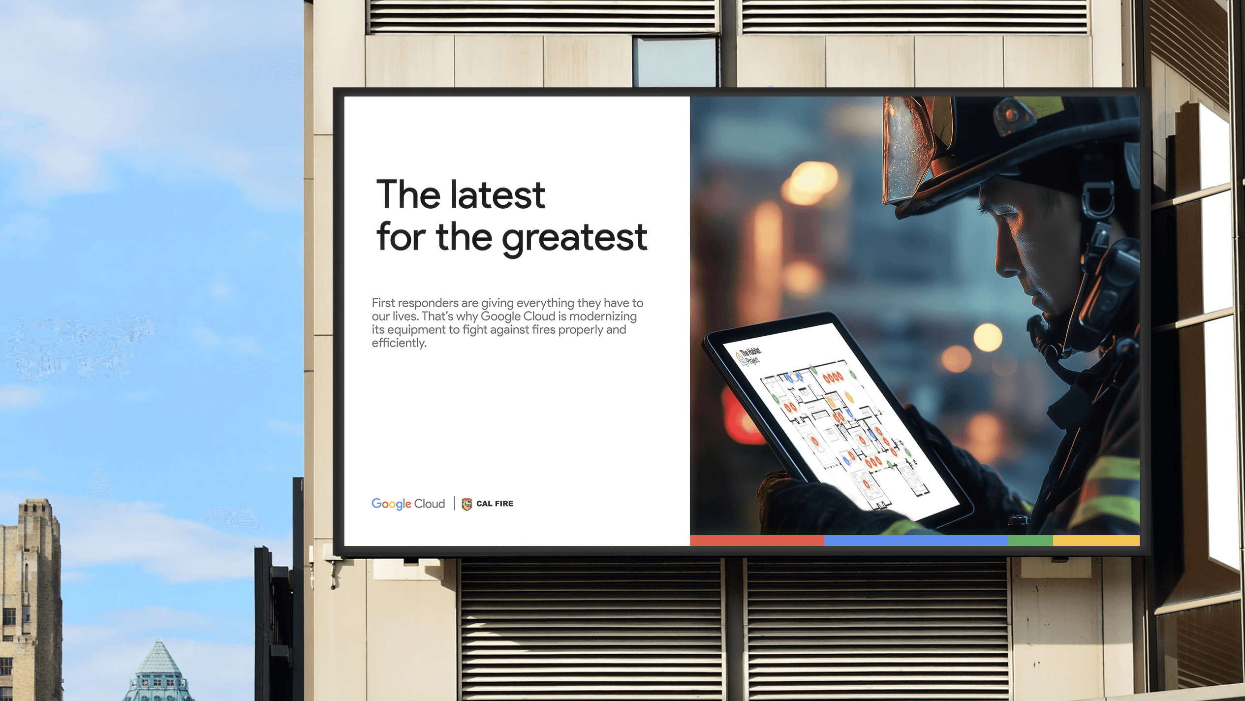 Outdoor ads contrast outdated paper blueprints with Google-powered devices, showing how tech can save lives in high-stakes moments.